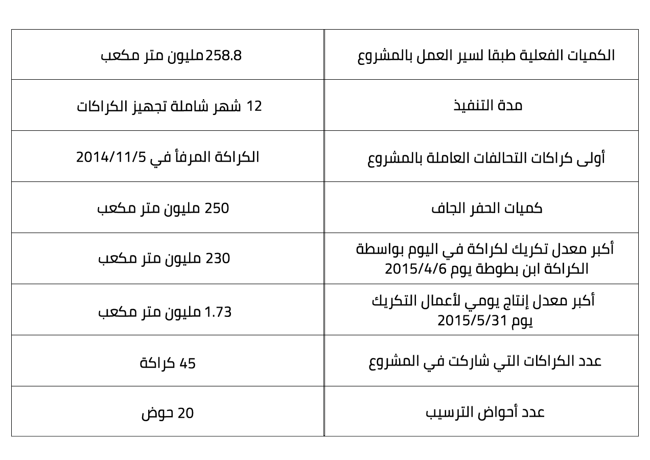 تبلغ إجمالي كميات أعمال التكريك 242 مليون متر مكعب بتكلفه تقديرية 15 مليار جنيه.بيانات الأعمال التي سيتم تنفيذها :
